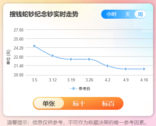 二轮蛇币发行量1亿枚,在二轮生肖币中仅次于8000万的二羊,本该有不错表现。