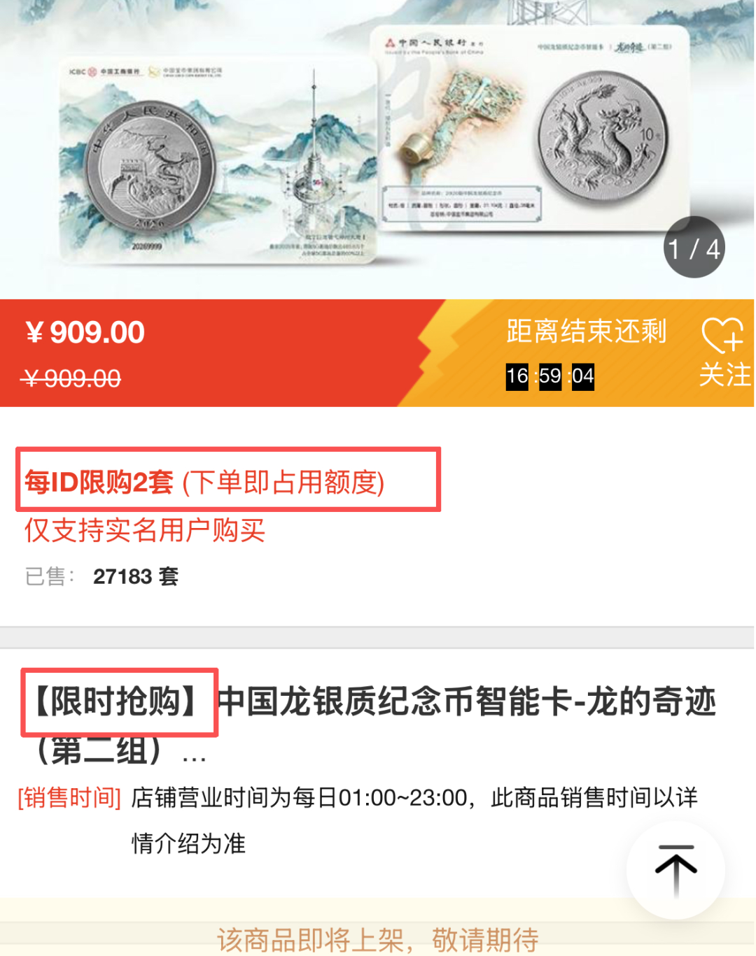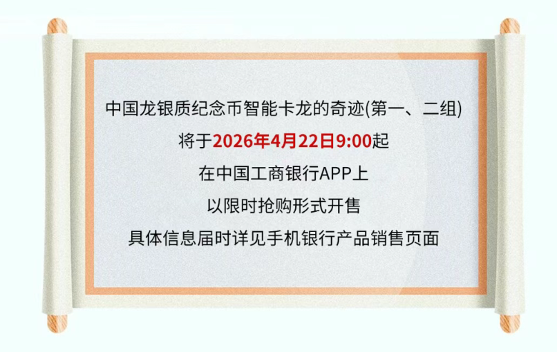 工商银行APP将在2026年4月22日上午9点启动“龙的奇迹”第一组(2025版)与第二组(2026版)中国龙银币智能卡的限时抢购活动。