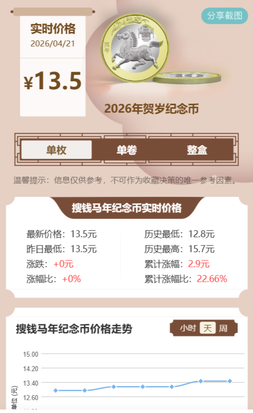 作为二轮生肖币的收官品种,马币此前最低跌至12.7元,近日价格小幅回升,最新批量回收价约13.5元左右。尽管涨幅不及马钞,但配套需求的支撑作用依然存在。