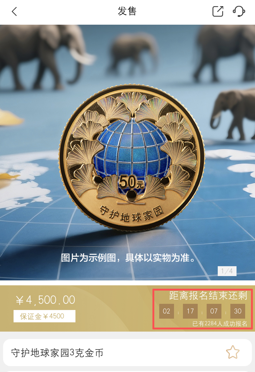 3克金币(单枚):面值50元,发行价4500元,每人限1枚
